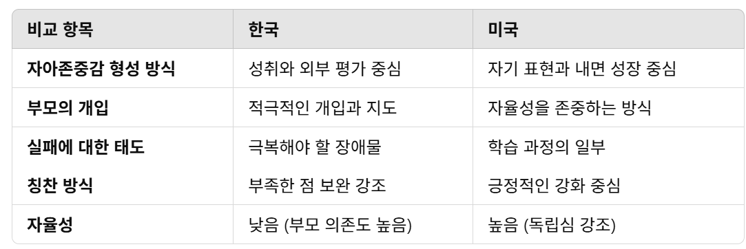 한국과 미국의 자아존중감 교육법은 각각 장단점이 있습니다. 아래 표는 두 나라의 양육 및 교육 방식을 비교한 것입니다.