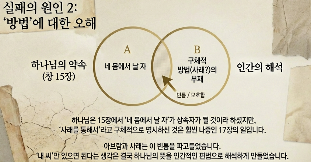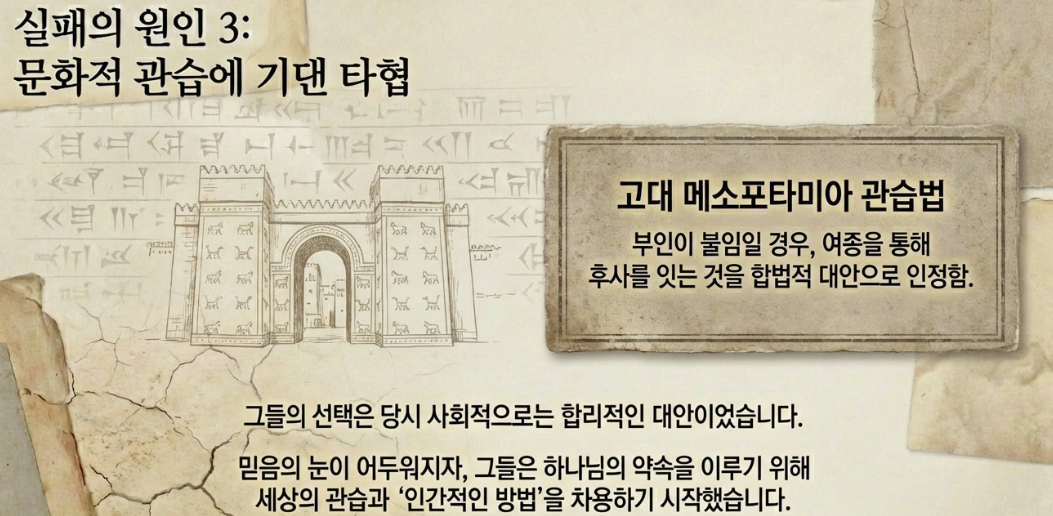 하나님은 15장에서 "네 몸에서 날 자"라고 말씀하셨지만, "사래를 통해서"라고 구체적으로 명시하신 것은 훨씬 나중(창 17장)의 일입니다. 아브람과 사래는 '내 씨'만 있으면 된다는 생각에 당시 메소포타미아의 법적 관습(부인이 불임일 경우 여종을 통해 후사를 잇는 관례)을 빌려 하나님의 약속을 '인간적인 방법'으로 도우려 했던 것입니다.