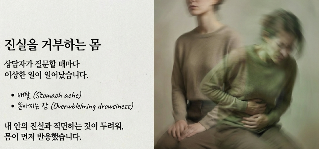 이러한 반응이 일어났던 이유는 내 안에 진실과 직면하는 것이 두려웠던 것 같습니다. 내면의 상처가 신체적인 반응을 통해 나타남을 알게 되었습니다.