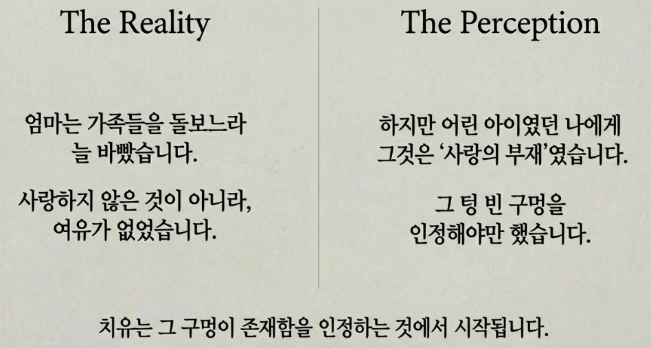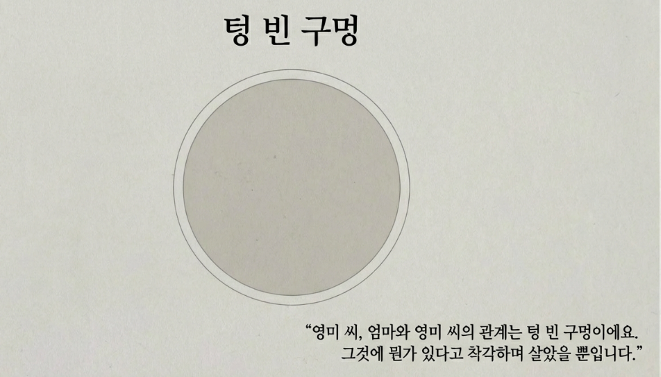 "영미 씨, 맞아요. 엄마와 영미 씨의 관계는 텅 빈 구멍이에요. 그런데 그것에 뭔가 있다고 착각하며 살았어요."
